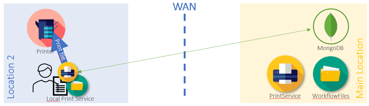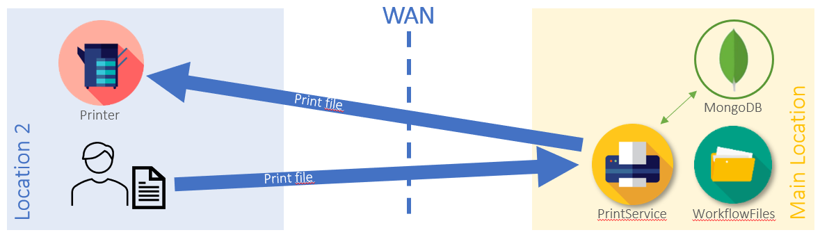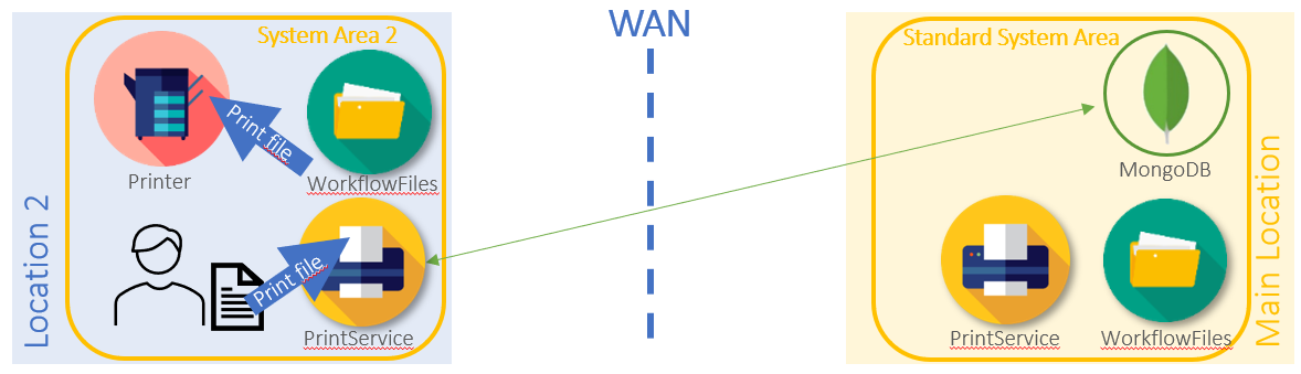 For example, two offices connected by a long-distance line (WAN) can be operated with one Kyocera Control installation. By default, a system area is created where the workflow files directory is created. The print jobs are stored here. In the example, the print jobs are therefore transmitted via the (narrowband) long-distance line.