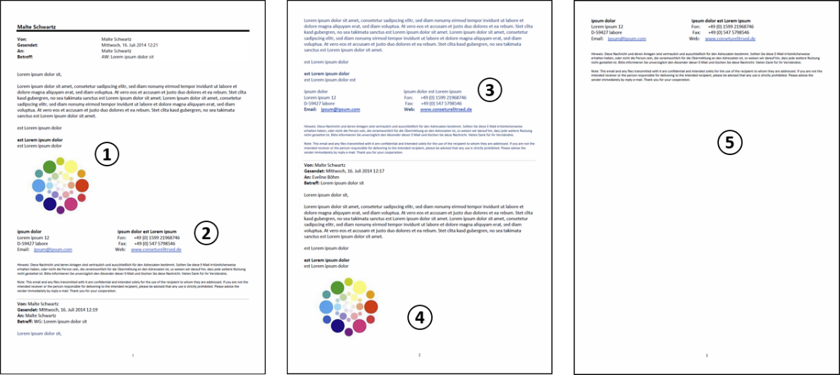 When analyzing this e-mail, five key points can be identified that make the document expensive to print. Point 1 is the color logo of the company. Point 2 is that the hyperlink for the homepage and the e-mail address are in color. The answer at point 3 is dark blue and thus contains color attributes. Point 4 is the color logo of the company. Point 5 makes it clear that the last page of the email does not contain any important information.