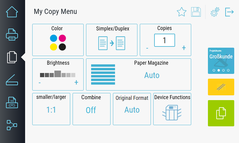 The copy dialog offers a menu that is the same on all devices, is very clearly structured and provides essential functions. Save the most frequently used copy settings as a workflow so that you don't have to set them again and again.